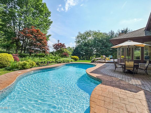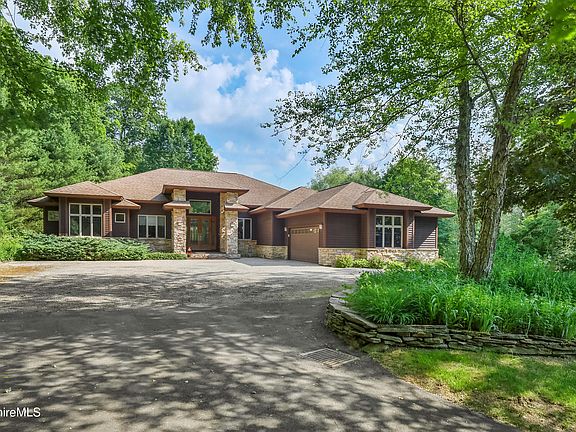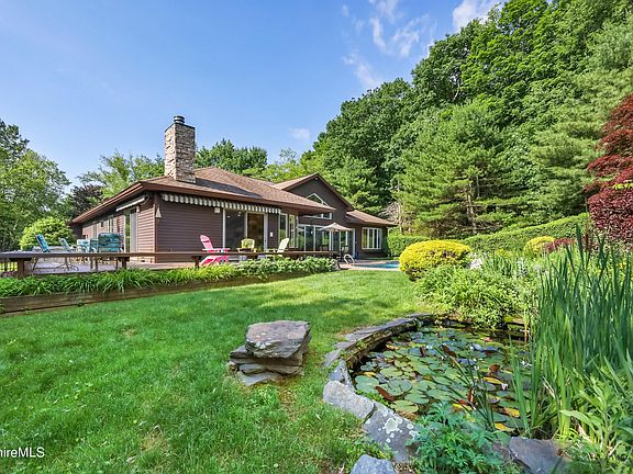 Incredible Berkshire Mountain Home - Frank Lloyd Wright inspired architecture capturing Berkshire mountain views. Its magical set on a hilltop enveloped in mature landscape, secret gardens with waterfalls and a coy pond surrounding the inground pool. Grandiose two story stone pillared entry welcomes you into the stain glassed door dramatic entry. Notice soaring ceilings, archways curved flooring to the sunken living room with walls of glass framing the beautiful outdoors. Formal dining open to this light filled entry. Central air makes the yearround sunroom perfect for relaxation, pool and bird watching. Thoughtful and easy one level floorplan flows to everyday dining, kitchen and floor to ceiling stone fireplaced family room. Saunter to the stone patio for outside dining, wade in the pool and listen to the waterfalls. Retreat in the evening to the west wing primary suite with a lovely sitting area, king size bedroom, whirlpool spa bath with stained windows, two custom walk-in closets, shower and private water closet. Bedroom 2 or office with full bath is convenient to sunroom and pool for guests. East bedroom wing offers two generously sized bedrooms and closets with ensuite bath, double sink vanity and separate tub/shower/toilet room. First floor laundry mudroom to access 3 car garage with ramp for easy access. Lower level finished family room, office and two bonus rooms add 2,000+ sf of extra living area with bulkhead egress. Experience the outdoors indoors while watching the clouds drift by, a storm blow in over the mountain and the state protected land that abuts this architectural beauty. Overlooking distant mountain views and rolling meadows above the Woodmonte Estates gated community experience serenity and security. The prestigous community and private setting create a nature preserve of your own with bridges over brooks, tennis courts and gated security. Close to lakes for water enthusiasts and central to all Berkshire attractions. A unique private setting amidst the conveniences of nearby city leisurely dining, arts and culture.