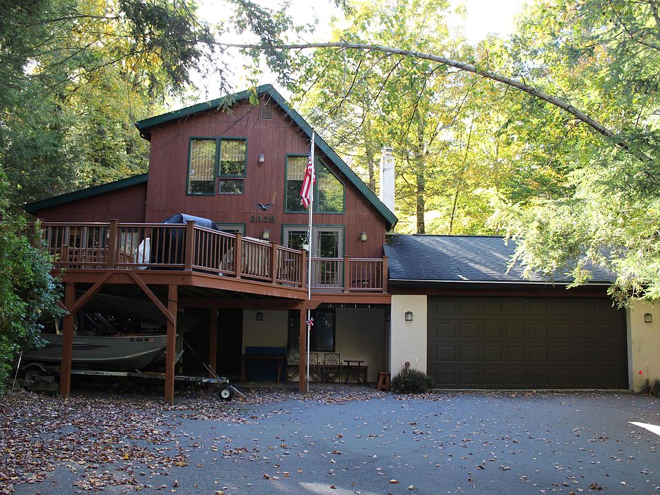 Beautiful Contemporary Chalet house is located on the Northside of the full amenity premier, gated community The Hideout. The Home is situated within close proximity to the clubhouse and the golf course. This spacious house is a private retreat due to its cul-de-sac location. The house offers a large deck and a recently added porch to enjoy those days and nights of outdoor country living. Some of the numerous features of the home include a recently updated kitchen with Quartz countertops and an island; newer appliances: refrigerator, over the stove microwave, freezer, and washer/dryer. A tankless hot water heater, and a newer garage, as well as pine wood flooring throughout the main level finish the house. There are 3 AC units and a whole house generator included.