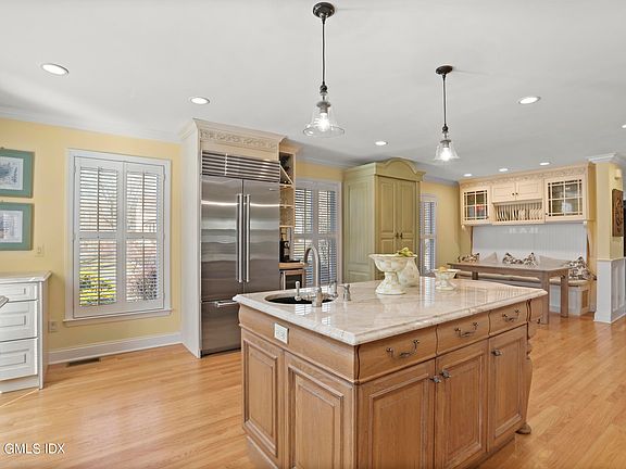 Wonderful serenity and bucolic vistas surround you in this gorgeous five-bedroom, five-bathroom home and carriage house positioned on a lovely cul-de-sac in Old Greenwich's desirable Hillcrest Park. Hardwood floors, tall ceilings and crown moldings add refinement, while abundant windows on four exposures fill the home with glorious natural light. On the main floor, enjoy spectacular open-concept living spaces for elegant entertaining and comfortable daily life. Relax in the large living room and host lavish dinner parties in the sunning dining area. In between, handsome barn doors reveal the expansive family room anchored by a wood-burning fireplace with a rustic beam surround. The updated kitchen dazzles with custom cabinetry, stone counters and the massive