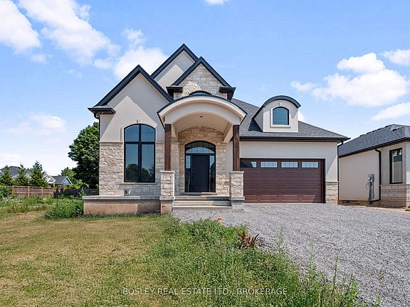 This brand-new home in Settlers Landing in Niagara-on-the-Lake is an absolute stunner. Designed and built by local builder Niagara Pines Developments, this custom bungalow is finished to a standard with gorgeous materials and design choices throughout. **For a limited time, the builder is including a recreation room in the basement at no additional cost. Contact us for details!!* Step inside, and the double-height entrance hall with an inlaid tile floor quickly sets the tone. This home perfectly blends comfort with style, whether for quiet nights at home or for spending time with family and friends. Everywhere you look, you'll see finishing materials that go well beyond industry norms. These include: Engineered hardwood flooring and tile throughout (no carpet), oak-stained stairs with oak railings and wrought iron spindles, stone countertops in the kitchen and bathrooms, a tiled walk-in shower, and a beautifully designed kitchen. Sliding doors lead out from both the living room and primary suite to the covered terrace, complete with a gas fireplace with stone mantel and cedar wood trim. The primary suite is the perfect end-of-day retreat, complete with a walk-out to the back patio, a full walk-in closet, and possibly the most stylish ensuite bathroom in town. The second bedroom has a grand feel with 10ft.+  ceiling height and beautiful chandelier. All of this is complemented by a distinguished exterior, finished with stone, stucco, and architectural dormers. This is your chance to own this exceptional property in blossoming Virgil. Construction is complete however sod and some final clean-up is still scheduled to happen. Otherwise, it is ready for occupancy!