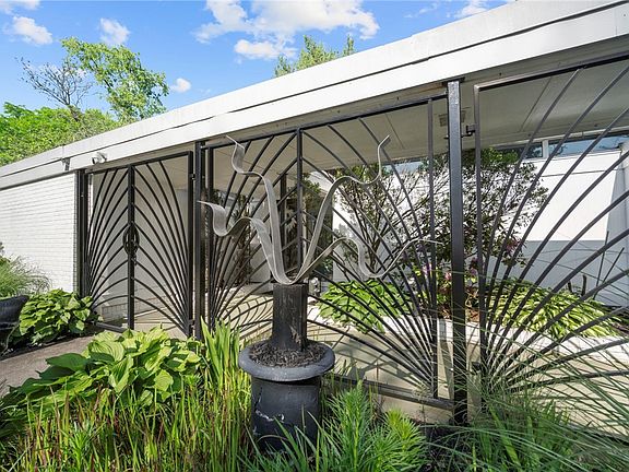 STUNNING MID CENTRY MODERN with clean lines marries Indoor Outdoor Living on just over 1/2 an acre. The striking single story has been preserved and thoughtfully updated. Custom Gate invites you to the Dramatic living rooms that anchor the home with its floor-to-ceiling glass wall framing uninterrupted views of the surrounding lush landscape inviting nature inside. The kitchen is a chefs dream reintroducing original elements with its solid wood cabinetry, double SS oven, fireplace, gas island cooktop and polished porcelain tiles throughout. Not only that it has an extensive bar area with granite countertops that surrounds a Char Grill & Commercial SS Exhaust Hood with exposed brick & Skylights. This open floor plan seamlessly extends to a Sunroom that leads to 1,200 sq ft of composite decking and a heated above ground pool complete with solar lighting. Home ensures continuous power with a whole house generator, security system, video surveillance, irrigation system & Landscape lighting