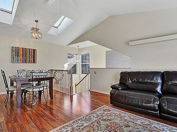 Beautifully updated, sun-filled two bedroom end unit town home in Wood Duck Pond at The Hills available for rent furnished or unfurnished! Hardwood floors grace this chic second level unit with fireplace, skylights, vaulted ceiling, and open concept living space. High hats and ceiling fans, too! Sliders lead to a relaxing deck! Enjoy meal prep in the newer kitchen with quartz counter tops, double sink, designer fixtures, white appliances and plenty of wood cabinetry. Spacious master suite with vaulted ceiling and updated bath with subway tiled tub/shower, granite topped double sink vanity, and trendy fixtures. Another bedroom, laundry and access to one car garage completes the home. Convenient location for commuting and all your lifestyle needs!