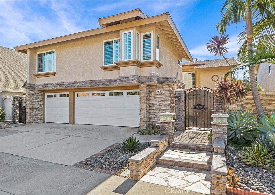 Built for entertaining, this magnificent 4 bedroom, 2.5 bath, 3 car-attached GARAGE, with private gated front & back yard is a true gem in Northwood. This exceptional residence presents an impeccable exterior with eye-catching stacked stone accents and a front courtyard enclosed by an inviting gate. The front courtyard that is paved with natural stone, lined with colorful potted plants, and adorned by a WATER FOUNTAIN. Upon entry, the ultra-high ceiling and the brilliant STONE fireplace that is designed up to the ceiling make a striking impression. The OPEN floor offers kitchen opening to both living and family room. The property features porcelain flooring throughout the primary level, double-paned windows, estimated 30+ recessed lighting, and plantation shutters. The gourmet kitchen boasts soft close cabinetry, double-stainless steel sink, granite countertops, and newer stainless-steel appliances. Host dinner parties or just relax in this spacious family room with a window slider to the backyard and grab a drink to watch Sunday night football at the bar room, equipped with a sink, soft close cabinetry, granite countertop, wine-rack, and wine fridge. The OVERSIZE primary SUITE enjoys polished porcelain, granite countertops, an upgraded set of his-and-hers vanity, premium shower, oversize bathtub, custom wall sconces, and spacious built-in closet organizers. Unwind from a busy day and relax in the primary BALCONY deck that offers views of the surrounding neighborhood. Elegant HARDWOOD flooring throughout upstairs. The three additional secondary BR have impressive square footage and reside on the opposing end of the property, offering privacy. The hallway BA is upgraded with marble flooring, wall, and shower! The vast backyard space outside is characterized by a NEW shady aluminum patio cover, designer STONE hardscape, persimmon, lemon, and rare fruit trees. Elegantly designed stone BBQ island with GRILL, SIDE BURNER, FRIDGE, SINK, & countertop space. This custom home comes with BRAND NEW EPOXY FLOORING & generous cabinetry, NEW furnace, NEW AC condenser, NEWER water heater, water filtration, and front/backyard sprinkler systems. Without any neighbors located behind the property, this private oasis is yours to enjoy with NO HOA, NO Mello Roos and routing to award-winning Irvine schools. Enjoy easy access to Irvine & Tustin Marketplace for dining/shopping amenities. Walking distance to Jeffrey Open Space Trail, neighborhood parks & Castle Park in Northwood.