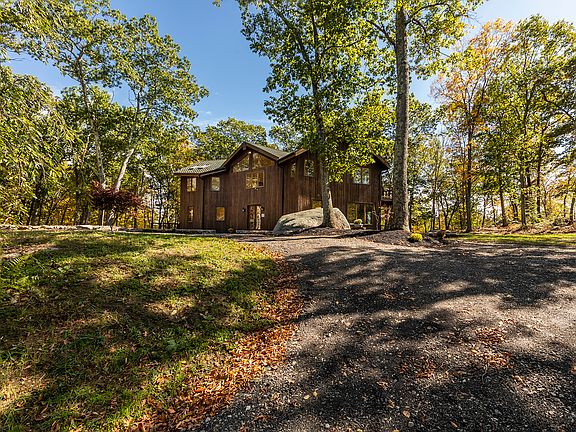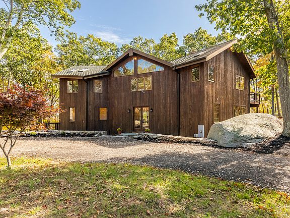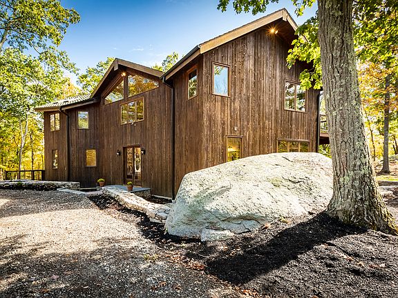 Modern in the Woods is a striking 4 bedrm, 3.5 bath home in bucolic Newtown, CT. Located off a country road, but close to town this outstanding modern befits the property highlighted by rugged rock outcroppings. With soaring ceilings, walls of glass, handsome wood ceilings and floors, expansive decks, this home is sited to take advantage of the seasonal vistas from almost every room. Upon entry one is amazed at the size and volume of the space as well as the natural sunlight afforded by the triple height ceiling and the striking double glazed oversized walls of glass. With an open floor plan, the great room, dining and chef's kitchen is one great entertaining space highlighted by skylights and triple storey fireplace. The Chef's kitchen has high end appliances, custom cabinets, granite counters, center island with built in microwave, and a wet bar center. Adjacent is a half bath and oversized laundry area. To complete the first level is a large master bedroom/guest room with large bathroom, walk in closet and doors leading to a fabulous deck. The second level has a great loft that connects a second master bedrm to the additional bedrooms of the second floor. All bedrooms have wood floors and ceilings, skylights and fantastic views of the property. A large unfinished basement has ten foot ceilings. Additional, amenities include 400 amp service, dual 330 gallon oil tanks and 100 amp service in the separate oversized garage/barn. Another building/home can be added to the property but can not be divided.