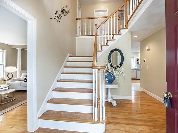 Life on Foster's Pond is special! So is this 4 bedroom 3.5 bath Colonial. Its classic detailing is coupled with today's popular amenities, including built-in seating & pantry cabinets in the spacious eat in kitchen, a lovely fireplaced living rm separated from the formal dining rm by gracious columns, a private home office, a fantastic finished walk-out LL with play rm and a mud rm with ample storage just off the 2 car garage. The airy & comfortable primary suite with en suite bath with jetted tub/separate shower plus 3 add'l good sized bedrooms and a full bath are on the second level. The large, private yard is nicely landscaped so you can enjoy the serenity from the deck & garden area or walk to the edge of the property to your private access to the pond where you can relax and watch the sun set. Enjoy boating, fishing & swimming. Convenient to downtown Andover and in the South/Doherty school district! Home offers geothermal heating/cooling & solar panels for limited cost utilities.