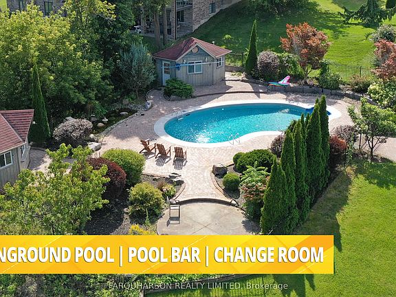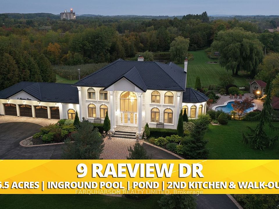 Custom-Built Executive Estate showcasing 5 Bedrooms, 5 Washrooms, and approximately 8,000 sq. ft. of elegant living space. Brand New Metal Roof (2025). Nestled on 6.5 acres with a picturesque pond, mature forest, and scenic nature trails. Features a family-sized gourmet kitchen with upgrades throughout. Striking Great Room with soaring double-height ceilings and 10 ft ceilings across the main level. Professionally finished walk-out lower level with a large bar, theatre room, sunroom, and a full second kitchen ideal for extended family, in-laws, or a nanny suite. Resort-style freeform swimming pool with two cabanas, surrounded by professionally landscaped grounds, patios, walkways, and a firepit. Approx. 1/4-acre pond, long circular driveway, and an oversized 4-car garage. Prime location just 3 minutes to Main Street and 2 minutes to Old Elm GO Station.