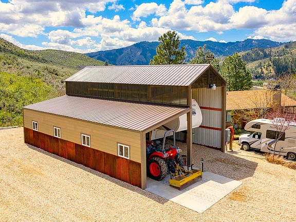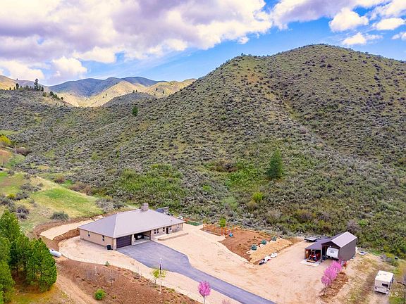 Easy Living Mountain life w/ Great Views & gorgeous mountain sunsets. Almost NEW home offering single level convenience w/ gorgeous stamped/stained concrete flooring for durable wear & tear, wood trim & wood doors throughout. Easy year around access & only a 20 minute commute to Boise. 8 Car garage capacity plus enclosed RV port w/ extra room for toys. Offers RV dump, electric & water hookup. Hot tub hookup, Fenced garden beds and green house to get your growing season started early. Extremely energy efficient, Hardy Plank siding. Far left garage is wired for 220 power and shop tools.