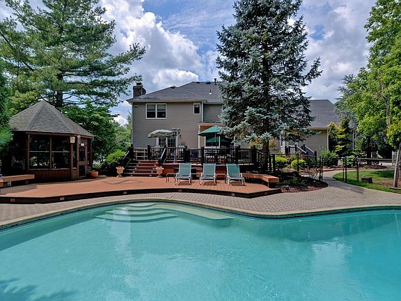 Dont miss this one! Fabulous Center Hall Colonial proudly situated on a level acre on a cul-de-sac backing to woods for privacy. Spacious Kitchen offers granite counters and high-end Stainless Steel appliances. The open concept floor plan features a Sun Room with skylights and a large Family Room with wood burning fireplace. The main floor offers a bonus Room that can be used as an office or 5th Bedroom. The Master Suite has two walk-in closets and full bath. Finished basement offers lots of options! A resort like backyard features large multi-tier, two-tone Mahogany/Hickory AZEK deck with TREX railing and illuminated steps. Newly resurfaced Anthony Sylvan Concrete heated pool with spa. Paver drive and walkways complete this picturesque setting. Foyer chandelier is on a motorized lift.