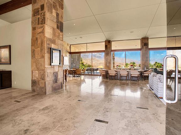 $100,000 PRICE IMPROVEMENT! Panoramic mountain, valley and evening-lit views adjacent the Ritz-Carlton resort, this architectural masterpiece is primed to elevate your lifestyle to luxurious new heights. Located on a cul-de-sac in the exclusive guard-gated community of Mirada Estates in Rancho Mirage, the sprawling single-level residence encompasses approx. 5,813 s.f. of spectacular living spaces. Experience a massive great room with floor-to-ceiling walls of glass, automated glass pocket doors, a stunning stone fireplace, and 15' ceiling heights. A step-down wet bar takes center stage, and the separate formal dining room reveals a 200-bottle wine room. Fit for the finest professional chefs, the home's magazine-worthy kitchen showcases stone countertops, custom cabinetry, an oversized two-tier island, a butler's pantry, casual dining area and commercial-grade stainless steel appliances. Truly state of the art, a new audio/video/security system makes it easy to set the right mood throughout the estate while enjoying added peace of mind. Fresh interior and exterior paint are featured, and luxurious new carpet graces select rooms. Five ensuite bedrooms and six baths include an attached casita, and a phenomenal primary suite with city views, two walk-in closets, a 6-head shower, soaking tub, and private gym. All living areas open to the outdoors where .57 acres host a sparkling saltwater pool and spa. Homeowners also enjoy discounted amenities at the 5 Star Ritz-Carlton Resort.