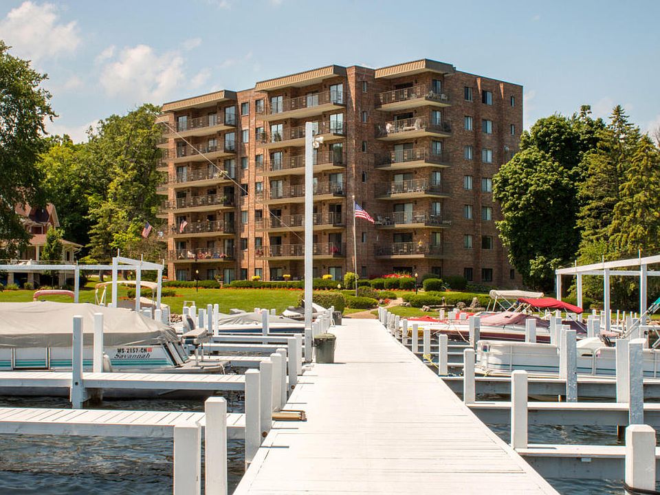 Check this place out! A rare fully rehabbed condo on the second floor of the amazing Bay Colony North building. Panoramic views of Lake Geneva and included boat slip. Unit is updated with hardwood floors and granite countertops. Stainless appliances finish gourmet kitchen. Indoor pool, party room and swim raft make this an all inclusive destination. Added baseboard heating in each room to accompany the forced air makes for easy year round comfort. Walk to Pier 290 or Cafe Calamari to enjoy some of the best dining in the area. Make this turnkey place yours for instant Lake Living!