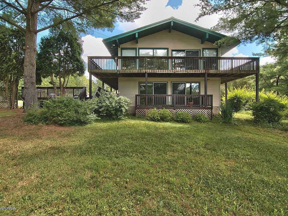 Lake View home in Spring Lake Estates. Beautiful 3 bedroom situated on a level acre of property features a finished lower level consisting of 2 well appointed rooms of which could be used as a 4th bedroom and a family room. The Main level features Oak hardwood flooring Cathedral ceiling and sliders to a wrap around deck overlooking the lake. The kitchen has been remodeled with new counters and newer cabinets. 2 car garage. Paved driveway. Central sewer. Large shed. Great Beach area. Minutes to shopping and all major highways. A true hidden GEM.