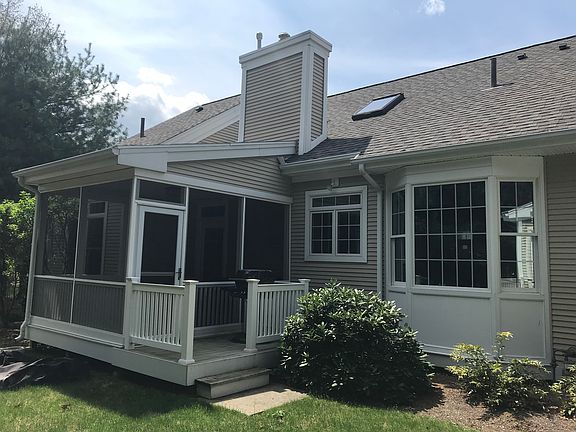 A wonderful Garden Style end unit condo. With 2 car garage, oversized driveway and a front porch seating area. Open floor plan with Living room/vaulted ceiling/gas fireplace/built in entertainment center. LR, DR & Kitchen have hardwood floors. MBR/2 walk in closets, large bay window in dining room. Access to a lovely screened porch from living room. 1st floor laundry. Immaculate throughout. Outdoor grill connected to home gas on deck.Kitchen has been updated with granite counter tops, breakfast bar and under cabinet lighting. Bonus finished basement adds another 616 ft. of living space. Bar and entertainment area with work shop.