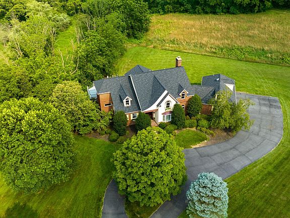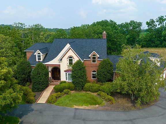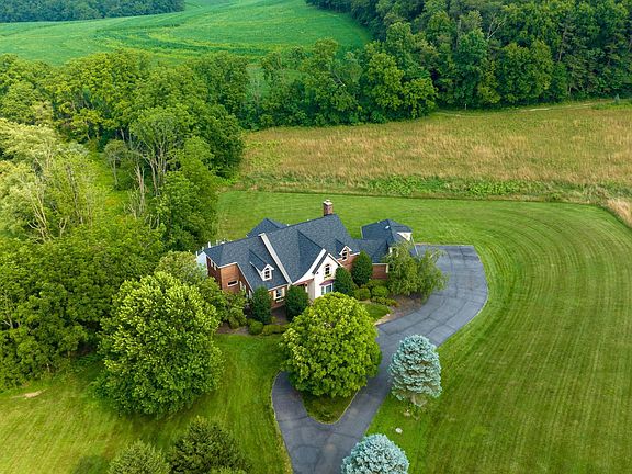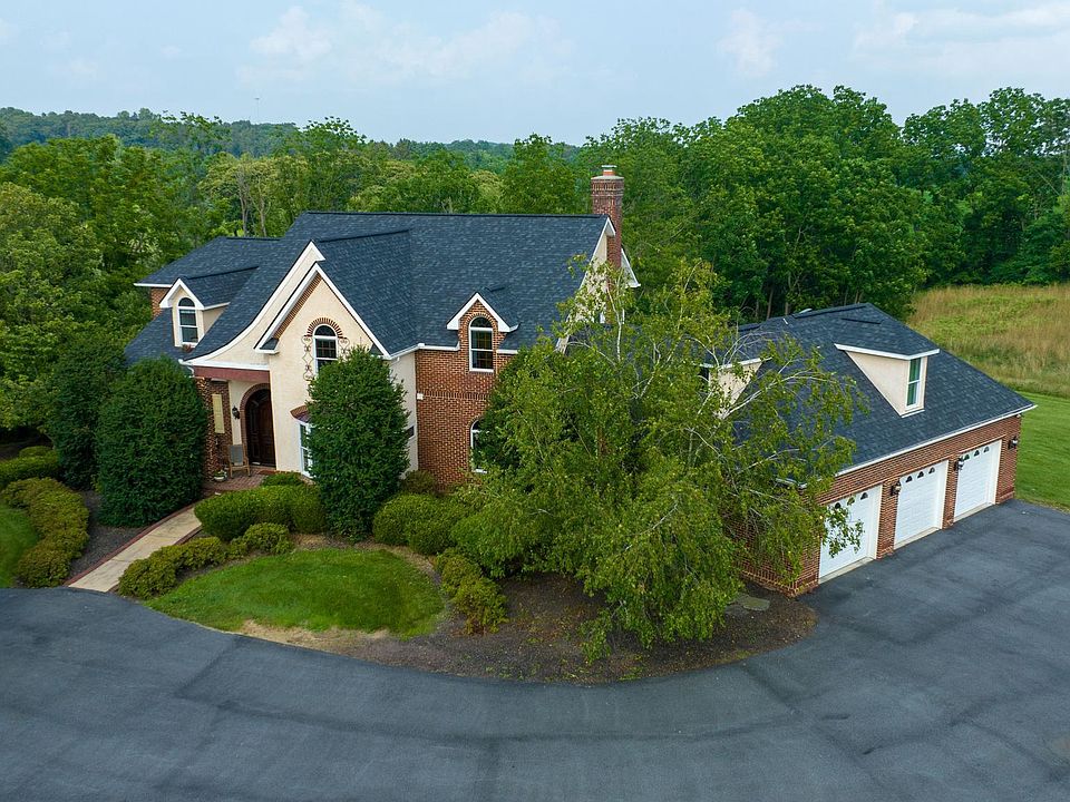 Quality French Country in a Serene Setting Just a short drive to Blue Marsh on a beautiful 4.87 acres that backs up to conservation farmland is a gorgeous French country-style, custom-built home, boasting angled rooflines, a lovely brick and stucco exterior, bold brick pillars with angled brick accent designs. Up the long driveway and to the arched, solid wood front door with glass surround, a 2-story foyer with Brazilian cherry wood floors makes a big first impression, while recessed lighting, cherry floors, and a speaker system enhance almost every room. Encourage guests to extend their stay in the first-floor guest bedroom with crown molding, walk-in closet, and ensuite bath. The main level also features an elegant dining room with built-in shelving and bench, bay window, decorative chair rail and crown molding, family room with floor-to-ceiling stone, gas fireplace highlighted by an old barnwood mantle, and slider door to back deck, and a media room with built-in entertainment system, gas fireplace, and double sliders to back deck. The French country-style kitchen is a chef’s dream, featuring a large center island with vegetable sink and breakfast bar, granite countertops, tile backsplash, double sink, Viking 6-burner stove, built-in sub-zero refrigerator and separate, full-sized sub-zero freezer, two dishwashers, trash compactor, under cabinet central VAC, and breakfast nook with built-in bench/storage, plus a separate walk-in pantry with shelving, while a nearby powder room with granite top vanity makes hosting even easier. Upstairs is the fantastic Master bedroom with a small sitting area, a tray ceiling, large walk-in closet, large glass doors to the private deck, and tile bathroom with a tall double vanity with Corian solid surface top, stall shower with glass door, Whirlpool tub, and built-in cabinet. Down the newly carpeted hallway, bedrooms #2 and #3 both enjoy walk-in closets and ensuite bathrooms with tile floors, stall showers, and large solid surface vanities, while the lower level offers a carpeted rec room that’s perfect for entertaining thanks to a full bathroom with tile floor and stall shower, multiple walkouts to the backyard, and large storage room. Relish in your home’s private setting from your expansive, Trex deck with stairs to private, back yard, while a separate 2nd floor bedroom suite above your 3-bay garage, featuring angled ceilings, an ensuite bath with stall shower and granite-top vanity, and separate hot water heater, offers a private escape for friends or family.