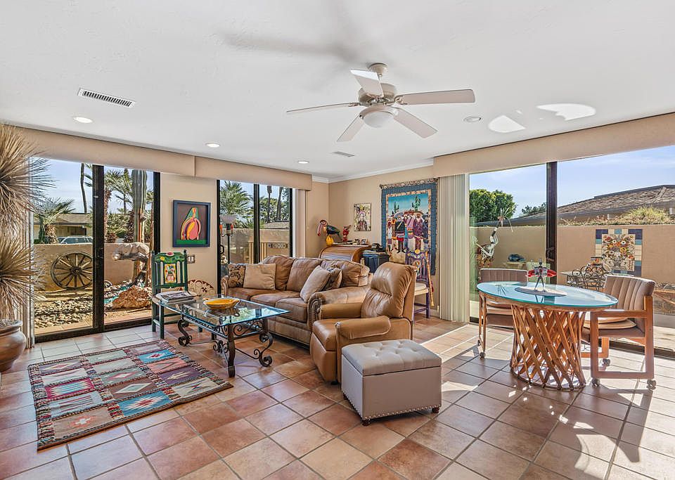 Quiet cul-de-sacTwo generous sized bedroomsDual patiosWalls of glass slidersTravertine slab fireplaceHand painted tilesWalk-in wet bar