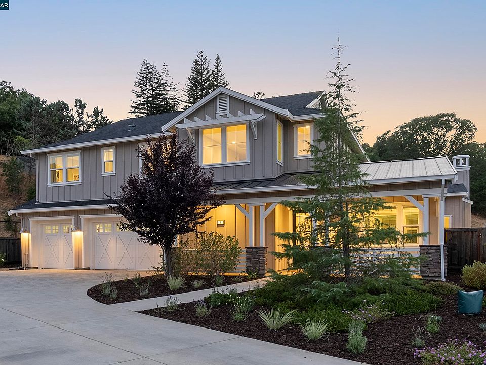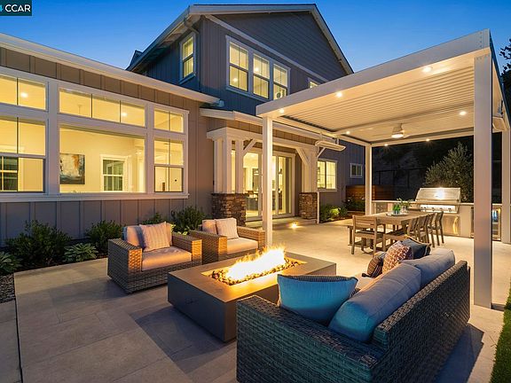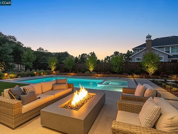 Nearly new construction, with over $600,000 in upgrades, distinguishes this lovely home. The residence, on a cul-de-sac, is just a short drive to Springhill Elementary and Acalanes High. One admires the brand-new David Thorne-designed yard, featuring a new pool, patio, pergola, BBQ island, fire pit, play area, maturing foliage and extensive new plantings. Entering the home, the foyer leads to a Great Room under a 14-foot ceiling, adjoining the well-appointed kitchen. Its centerpiece is the marble island counter, which accommodates 6 or more for casual dining. White cabinetry and top appliances encircle the kitchen, with hardwood underneath. A butler’s pantry (with wine refrigerator) sits adjacent, leading to the formal dining room. Cooking is equally easy outside; a grill and dining area sit under a StruXure pergola. Work from home is easy in the spacious office adjoining the foyer. Four bedrooms are up the stairs; the fifth is on the main floor. At the top of the stairs is a family room/playroom, with the bedrooms in every direction from there. The primary suite includes a custom walk-in closet. The adjoining bathroom features an oversized shower and stand-alone tub. The laundry room is conveniently located amidst the upstairs bedrooms. The 24 freeway is just a short drive away.