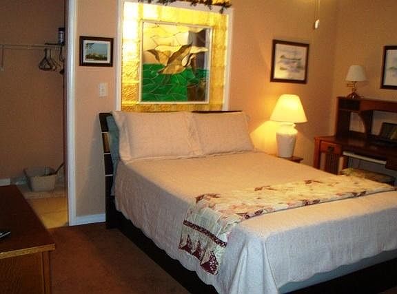 SOUTHERN COMFORT FAIRHOPE, ALABAMA FULLY FURNISHED!! VACATION/SHORT/LONG TERM Quiet and secluded Townhouse located 1 mile south of downtown on small Cul-de-sac with easy access via sidewalk to shopping, restaurants, mobile bay and all that friendly Fairhope has to offer or drive to Gulf Shores Beaches, Mobile and Battleship Park, Bellingrath Gardens, Pensacola, Golf Courses and many more attractions. This nicely furnished and decorated home has a large Great Room that can be accessed from the garage, front door or the back door has ceramic tiled floors and a small carpet with a comfortable lounge chair, sofa and dining area with a large plate glass window to view the birds plus a large, flat screen TV with surround sound entertainment system for your enjoyment. French doors lead to a private wood deck with awning and a large, heavily wooded back yard. The kitchen is located off the Great Room in the front of the home and also has ceramic tile flooring with plenty of granite counter space for working and a bar for dining plus a quaint, tiled table for 2-4 looking out the front bay windows. You will find all the kitchen appliances for your needs including, dish washer, double stainless sink with garbage disposal, microwave oven, coffee maker, stove with self cleaning oven, pots and pans for cooking and a large assortment of dining utensils, plates, bowls and glassware. The master bedroom and master bathroom are also downstairs and can be accessed from the great room OR from the single car garage, (where the washer and dryer are also located) so you can walk directly from your car into the bedroom without going through the rest of the house. There is also a small closet under the staircase for storage and cleaning supplies. The master BR has a queen size bed and is nicely carpeted. A desk with a built in light for office work is also in the bedroom along with a deep dresser for clothes storage and a love seat that reclines for reading or watching TV. The walk-in closet and bathroom have ceramic tiled flooring with wheelchair access for those that may be elderly or handicapped to easily get from the BR to the bathroom with NO DOORS to interfere but still retain privacy. The walk-in marble shower also has two shower heads, one is a fixed rain type shower head and the other a hand held shower head which are selected by a two way valve. there is also a seat with handrail. The vanity has a granite counter top with storage underneath, a large mirror, medicine cabinet and a high profile toilet with hand rail. The second bedroom is located upstairs and also has a queen size bed and is fully carpeted and includes a large closet, dresser, small TV and a lounge chair. The bathroom flooring also has ceramic tile with a granite vanity, large mirror, medicine cabinet and a deep marble tub with shower head. A new heat pump HVAC system was installed in 2016 that provides great heating and cooling to the entire house. Also included are ceiling fans in each room, pest control service, yard service including mowing and leaf blowing, a single car garage with door opener remote control. Dogs are allowed with approval from the landlord with a $150 non-refundable pet fee. There is no maid service but there is a one-time $175 fee for cleaning service upon departure.