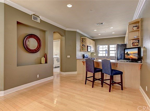 Stunning 2 bedroom townhome located in the Aldenhouse neighborhood of Ladera Ranch! As you enter the front door and walk into the inviting living room with cozy fireplace, you are greeted with soaring vaulted ceilings showcasing the abundance of natural light. Upgrades include Maple hardwood flooring, new carpet, fresh paint, custom baseboards, plantation shutters, and ceiling fans. Open light and bright kitchen boasts stainless steel appliances, corian countertops, recessed lighting, and lots of cabinets. Attractive open staircase with Linen cabinets at the top of stairs. Upstairs you will find the large master suite that offers a walk-in closet, dual vanities, separate shower and tub perfect for relaxing. 2 car garage completes this beautiful townhome. Centrally located and walking distance to downtown Ladera, town green, schools, parks, and pools.