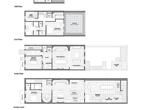 The PARLOR LEVEL would have a welcoming foyer and gallery with an elevator, a bedroom with an en-suite bathroom that can also be used as a library or office, and an expansive dining and great room with a gas fireplace, wet bar, and steps leading down to the backyard.