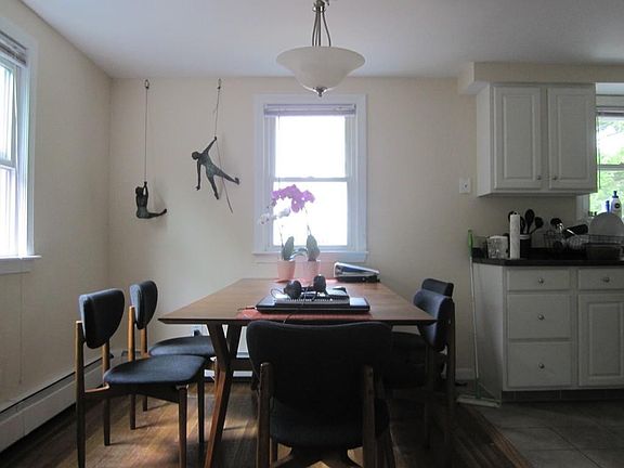 Bright and sunny duplex style home with newer kitchen and baths on cul de sac. Newer windows and roof, well maintained, full unfinished basement with laundry hook-ups, great common yard space. Half bath on first floor. Three bedrooms feature hardwood floors. Fresh coat of paint and newly finished hardwood floors. Kitchen and bath tiled. Hardwood floors in eating area. Great condition.