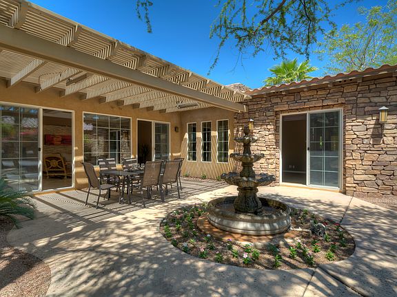 Enjoy life on the lakefront at Santo Tomas! Tastefully upgraded on approximately 1/3 acre. The yard is south-facing & provides panoramic view from the awesome custom designed outdoor living areas. Enjoy entertaining in the fabulous outdoor kitchen with BBQ, cooktop, sink, dining counter with gas fire pit. Covered side patio has ceiling mounted infrared space heaters. Meander down to the lake to a romantic fire pit sitting area, perfect for watching the sunset. A private dock for your future boat on the 10 acre lake. Tame those nasty electric bills with owned Solar system!! A/C system separately zoned for comfort & efficiency. The interior is simply exquisite & boasts tile flooring with contemporary carpeting in the 3 bedrooms. The well-equipped island kitchen is a delight for cooking. The entertaining rooms boast stack stone accents, with a location for wall-mounted TV in living room & built-in speakers are inside and out. HOA fees include Mission Hills sport-social membership.