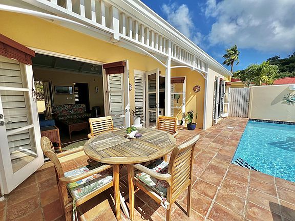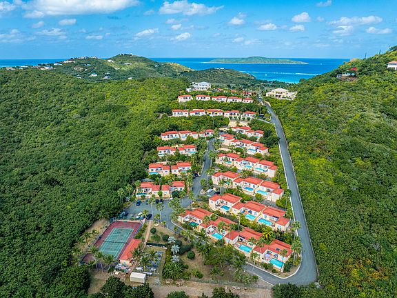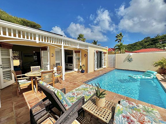 This is, without question, the BEST location in the entire Villa Madeleine complex! Located at the highest level with unmatched, straight-on views of the Caribbean Sea, this premier end-unit villa w/ pool offers the ultimate in privacy, accessibility, and breathtaking scenery. With no stairs to navigate inside or out - this 2-bedroom, 2-BR retreat is designed for effortless island living. Every detail has been meticulously upgraded, with high-quality renovations throughout the kitchen and bathrooms. The kitchen is a showstopper, featuring rich cherry cabinets that perfectly complement the Silestone Quartz countertops. Both bathrooms have been beautifully updated with top-tier materials, ensuring a refined and luxurious feel. In addition to the privacy afforded by an end unit, neighbors directly to your side and no other villa owners or guests passing by your front dooryou also have access to a convenient side yard (common area). This added outdoor space feels like an extension to your outdoor living space off of the pool deck and is perfect for taking your pet out for a bathroom break or could be an ideal spot to install a generator. While the complex has rules regarding generator installations due to neighbor proximity, it is generally understood that end units, with their more secluded positioning, have a greater likelihood of receiving approval for a permanent generator (though this has not yet been officially verified for this unit).