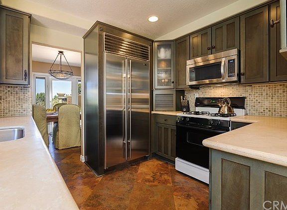 Beautifully upgraded Monaco villa on a cul-de-sac with a view in fabulous Marina Hills. Gated courtyard entry, formal living room with fireplace, balsam vertical ceiling fan, custom window casings and french doors opening to the lovely backyard patio with paver tiles and planters. Dining area with french doors to yard. Remodeled kitchen with custom cabinets, Travertine counters, onyx tiled backsplash, Sub Zero refrigerator and sunny breakfast nook. Downstairs bedroom/office/den. Powder bath with stone pedestal sink. Each of the two upstairs bedrooms has its own bath. Main floor with ceramic tile and new carpet upstairs. Inside laundry, two car attached garage with direct access. Marina Hills amenities include competition sized pool, spa, clubhouse, ball fields and six night lighted tennis courts.