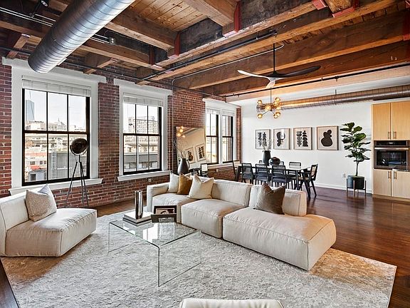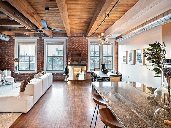 Rare opportunity: Coveted two-bedroom/two-bath corner loft with ideal layout at sought-after Court Square Press building. South and west sunlight, skyline and sunset views from huge windows in each room. Exposed brick, 11’ original wood-beamed ceilings, hardwood floors. Generous, open living/dining areas flow into entertainers’ kitchen with stainless-steel appliances, stone counters, impressive storage, spacious island. Gracious primary suite with large WIC easily fits king bed, dresser, desk. Large adjoining bath features special cylindrical shower in former smoke stack. Second bedroom fits queen bed and desk/dresser. Second bath with tub, large vanity. New HVAC, washer/dryer, oven, dishwasher, light fixtures. Deeded, well-positioned garage parking spot. Amenities: 24hr concierge, full gym, expansive outdoor terrace with pool and grills, screening room, bamboo courtyard, bike storage. Red Line T stop across street, easy access to I-93 & I-90, minutes from airport and South Station.