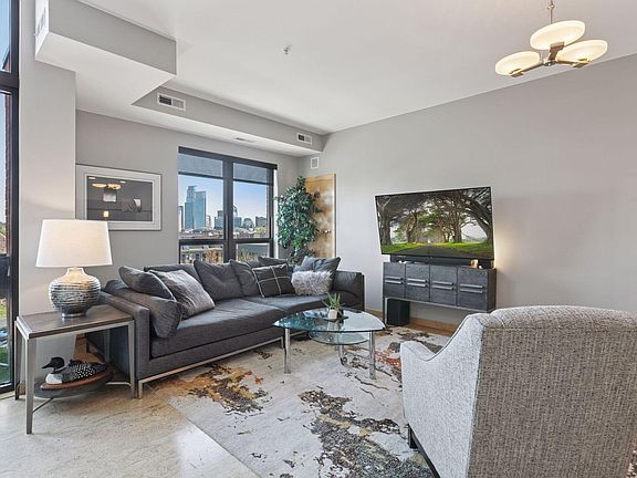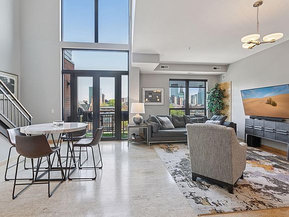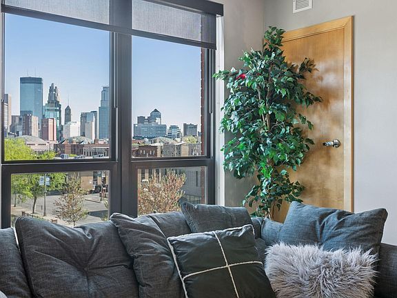 UNOBSTUCTED SKYLINE VIEWS! This striking, contemporary condo offers panoramic views of the Minneapolis skyline through a dramatic two-story wall of windows—truly one of the best views available in the building. Rare newer construction (2004) with a modern aesthetic and open-concept design, this home is flooded with natural light and delivers a seamless blend of style, space, and comfort. The main level features cork flooring, a spacious living area perfect for entertaining or relaxing, and a sleek center island kitchen complete with granite countertops and stainless-steel appliances. The flexible floor plan allows you to customize the space to fit your lifestyle. Upstairs, the lofted second level includes a primary bedroom suite with a private bath, laundry, and a second bedroom, conveniently located near a full hallway bath. Step out onto your private balcony and take in the city lights—your own serene urban retreat. Residents also enjoy access to a huge, shared terrace with a rooftop feel, ideal for entertaining larger groups, as well as a community garden with raised beds for your green thumb. Additional highlights include secured, underground heated parking, a private storage area (Not all units have this), and an unbeatable location surrounded by art, culture, dining, and easy access to I-94, 35W, and the airport.