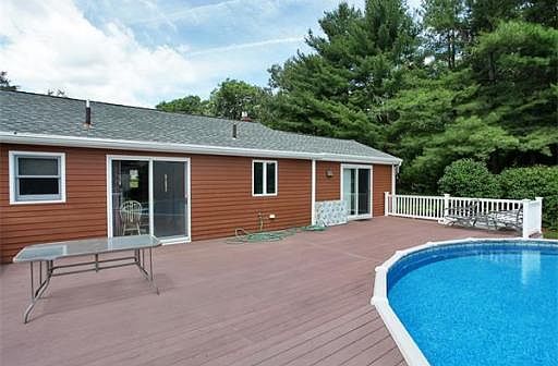 Lovely maintained ranch home nestled at the end of an established cup-de-sac neighborhood. Move in ready features include updated applianced eat-in kitchen with glass sliders to deck and pool. Open dining room/living combo features fireplace with gas insert and large screen TV above. Enclosed air-conditioned sun room with cathedral ceilings and sliders to deck and yard, Full, finished walk out basement offers second full bath with laundry room, applianced summer kitchen, third bedroom potential, and large family room area. Home is centrally air-conditioned with hardwood floors throughout. Great location, near highways and schools.