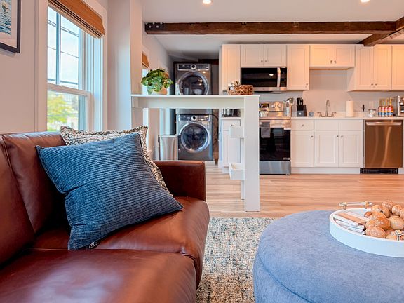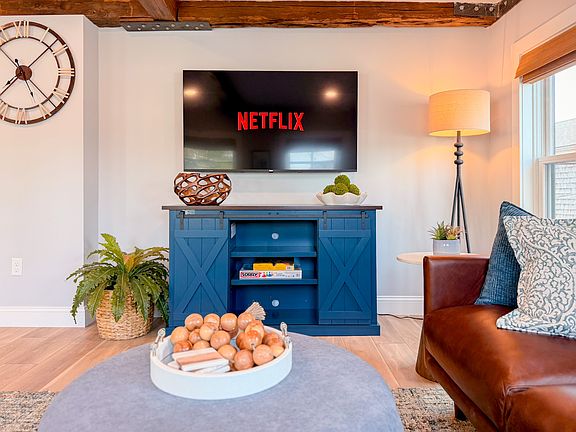 Step inside to find a bright, open-concept living space with exposed beams and coastal-inspired decor. The fully equipped kitchen includes stainless steel appliances, a dishwasher, and all the essentials for home-cooked meals. Relax in the cozy living area with plush seating and a smart TV, or enjoy morning coffee at the dining table with sunlight streaming through the windows.