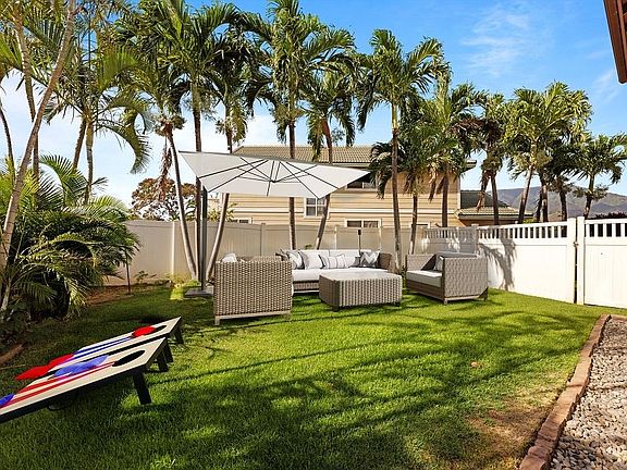 HONEY, STOP THE CAR! MUST SEE AND PRICED TO SELL NOW! Currently, the only home for sale in this desirable community of The Legends at Maui Lani (at time of listing!). Stunning West Maui Mountain Views surround you at this Island Style 4 bed/2.5 bath 2-story residence located on a cul-de-sac street with a generous sized landscaped yard -- ideal for entertaining and outdoor activities (Take note of its distance between the neighboring homes, and property backs up to vacant land which offers added privacy and openness). Additional custom features include: FRESHLY PAINTED INSIDE/OUT (DEC 2024), Pergo style "Koa curl" flooring in the living/dining/kitchen area; galley style kitchen that opens to living area with walk-in pantry; Upstairs primary suite offers vaulted ceilings, walk-in closet and dual sinks in bathroom; CENTRAL A/C, Solar water heater, 2 car garage, fully fenced-in yard with sprinkler system; Rain gutters; Outdoor shower by side gate to wash down after a day at the beach; Oversized concrete pad outside of living room slider to add patio seating area, gazebo, and/or jacuzzi spa...so much potential to create your own backyard oasis! Definitely one of the best values in Central Maui today! If you're a golfer, lucky you, the Maui Lani clubhouse and new Fuego Restaurant are right around the corner! Centrally located to the OGG (Kahului airport), Costco, Maui Mall and Theaters, the MACC (Maui Arts and Cultural Center), the U of H Maui Campus, Kanaha Beach famous for windsurfing, newer elementary school, and Maui Memorial Hospital are just minutes away!