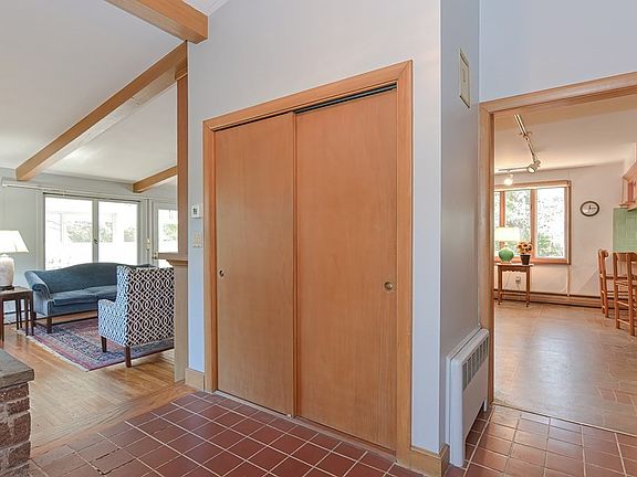 Built during the mid-century modern era, this home is set back from the road on over a 3/4 acre corner lot. The large covered front porch welcomes you into the large foyer with a coat closet. To the left, the front-to-back living/dining room has beamed vaulted ceilings, a wood-burning fireplace, and access to the screened-in porch. The large kitchen has tons of storage, counter space, and a fireplace for added warmth. From the foyer of this multi-level, step up to the bedroom areas, while steps down lead you to additional living space. Upstairs consists of the main bedroom suite w/ bath, 2 guest rooms, and a 2nd full bath. Downstairs has a family room w/ access to the flagstone patio, half bathroom, laundry, and the 2-car garage with a large unfinished basement area. The home has hardwood floors and large replacement windows throughout the home that bring in loads of natural light. Boiler '19. Oil tank '03. Ext Paint '21. New Septic to be installed by seller. Offers due by 11/22 at 9am