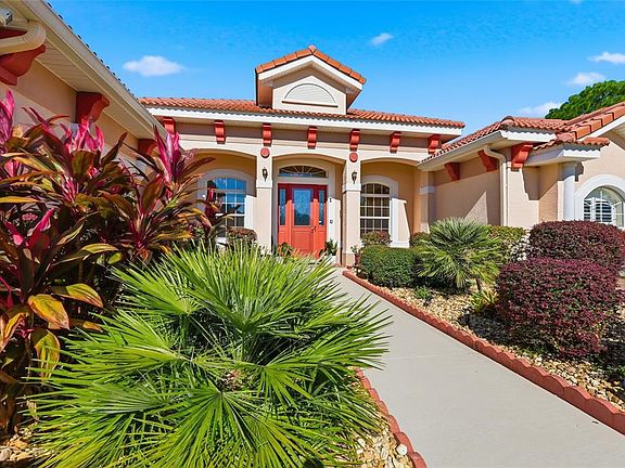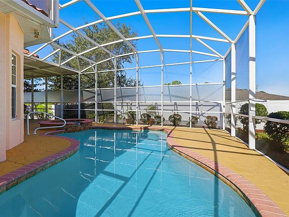 One or more photo(s) has been virtually staged. Garden Club award-winning landscaping sets the tone for this peaceful pool and spa retreat in the Pine Lakes W Section. Tucked on a quiet cul-de-sac of tile-roof homes, this thoughtfully maintained, custom-built 4 bedroom, 3 bathroom residence offers privacy, natural light, and comfortable everyday living. Inside, soaring and tray ceilings highlight open living spaces filled with sunlight. The kitchen includes Kraft Maid cabinetry and a double oven, with living and dining areas that flow seamlessly to the lanai and pool. The primary suite opens directly to the pool and features a walk-in closet and a spa-inspired bath with hydro-jet soaking tub, walk-in shower, double vanities, Kohler fixtures, and a built-in wall safe. Bedrooms two and three each have their own full bathrooms—ideal for guests. The fourth bedroom is currently used as an office and offers flexible use options. Outdoors, the screened pool and spa include a new gas heater (2023) and a spacious lanai for shaded outdoor living. The Garden Club award-winning landscape features programmable warm LED lighting and a self-watering planter system for easy maintenance. The tile roof has been freshly pressure-washed, and white PVC fencing adds privacy. No HOA. Centrally located near golf, shopping, dining, and just a short drive to the beach. A home designed for comfort, care, and the Florida lifestyle.
