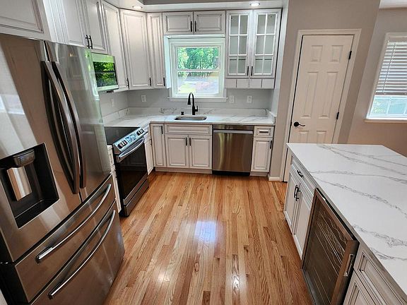 New hardwood red oak flooring in living room, kitchen and hallway. Kitchen: New 42" sunnywood kitchen cabinets. New stainless steel Samsung appliances - French door refrigerator with ice and water dispenser through door. New microwave above stove. New slide in range. New stainless steel dishwasher. New quartz calacatta gray countertops. New wine cooler. New lighting fixtures throughout. New ceramic tile in bathrooms. New bathroom vanities with quartz countertops. New bathroom fixtures throughout. New carpet in bedrooms. Screened in porch and deck. Lower level has new vinyl plank flooring and gas fireplace. New roof with architectural shingles. Seller prefers to use Jacquies Title Group for settlement.