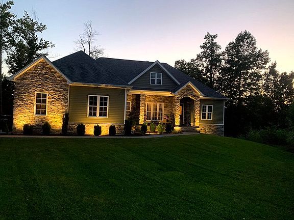 Gorgeous custom built home features solid hardwood, tile and 9 foot ceilings throughout (both upstairs and downstairs). With tons of large windows letting in lots of natural light and custom cathedral, tray, double tray and coffer ceilings specifically situated to highlight the home's large rooms and open concept. Beginning in the large dining room, that is perfect for big family gatherings, with elegant wainscoting and lighted double tray ceilings. Move freely to the living room, featuring 17' tall cathedral ceilings with timber style beams and the focal point of the room is a huge stone fireplace that runs from floor to ceiling. Partitioning the living room from the kitchen is a large kitchen island. The kitchen features beautiful coffer ceilings, GE slate appliances, 42" tall cabinets, large pantry, desk area and breakfast nook. Back across the living room is the huge master suite, with a gigantic triple window that piers out over the secluded back yard, with plush grass surrounded by beautiful mature trees. Complimenting the natural light supplied by the many windows in this room is crown molding and lighted tray ceilings. Adjoining is a huge master bathroom with a massive 12' wide his and hers shower which compliments the his and hers sinks, built-in makeup vanity, separate toilet room and large walk-in closet. Across the house you'll find two additional large upstairs bedrooms separated by a Jack and Jill bathroom with a double sink vanity, oversized bath tub with tile walls and shower. The upstairs also features a mud room, powder room, outdoor deck and a screened-in porch with TV area and 17' tall vaulted tongue and groove cedar ceiling. Moving downstairs to the finished basement you'll find a huge family room that features a TV area, a recreational area, large stone wet-bar complimented by a cedar lap sided pantry that includes water and electric hook-up for a refrigerator. As you look to the back of the bar you'll see a stone wall surrounding a genuine vault door. Serving as the backdrop of the bar is an extravagant 140 sq/ft cedar lined VAULT ROOM, completely encapsulated in concrete from ceiling to floor and secured by a 900lb 18-bolt vault door. The basement also includes a full bathroom and two additional rooms that can be used as bedrooms, or serve as an office and one that currently serves as a play room but has been completely wired to serve as a theater room. The basement also includes a garage for easy access to a workshop and storage, a large utility/storage room, and a huge covered patio with TV area and waterproof cedar covered ceiling. This home is conveniently located in Elizabethtown but uniquely sits completely secluded at the end of a cul-de-sac with a back yard that provides magnificent views and COMPLETE PRIVACY.