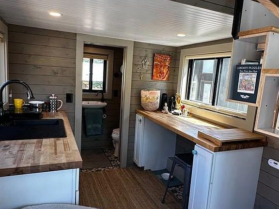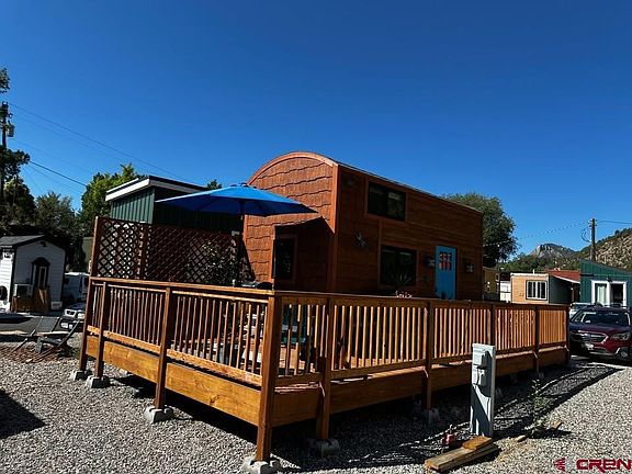 Discover the charm of tiny living in this beautifully crafted 18ft x 8.5ft fully furnished tiny home, situated on a premium lot in a friendly tiny house community in Durango, Colorado. Enjoy a spacious 26ft deck with stunning mountain views, a unique curved roofline allowing for more height in the sleeping loft, and plenty of windows for natural light. Inside, the sleeping loft features cubby storage, while the functional kitchen boasts two butcher block counters, a large sink, an induction cooktop, and an under-counter fridge. A stylish Moroccan brass chandelier adds elegance to the space. With ample storage, an LG mini split for heating and cooling, and a propane fireplace for chilly nights, this well-built, well-insulated home is in like-new condition. Ready to move in or relocate. * No Real Estate Included