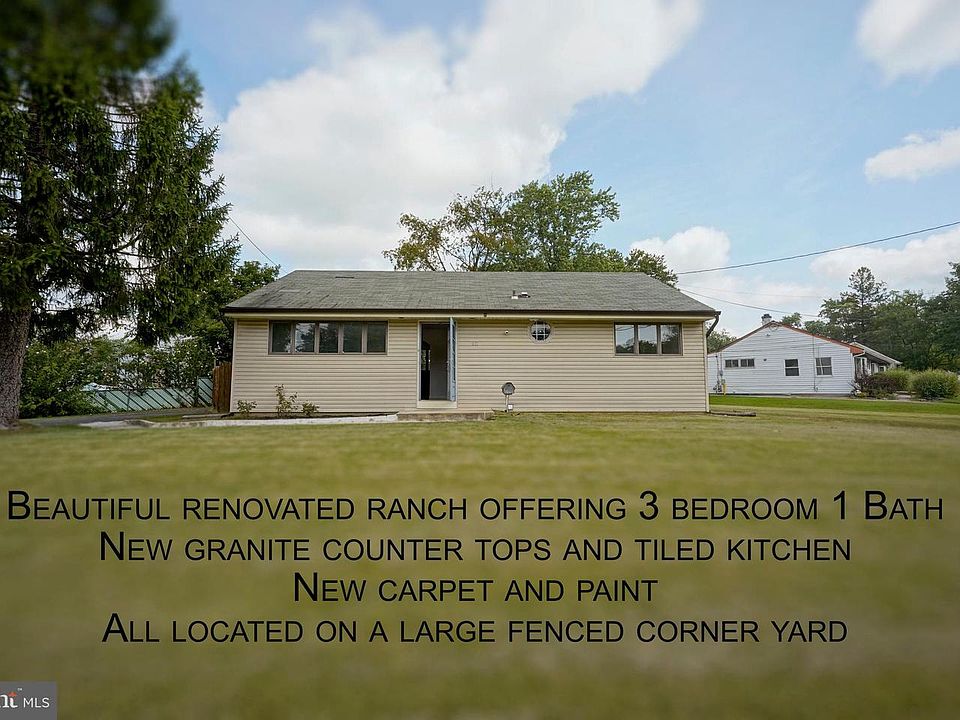 Renovated Rancher on a desired corner lot. Home offers 3 bedrooms 1 bath with large corner yard fully fenced and oversized driveway. ROOF 2020, Windows 2020 Freshly Painted, New Carpets. Enter this home to a hardwood floored spacious living room that leads to Kitchen that offers brand new granite counter tops and backsplash. There is ample area adjacent to kitchen for a dining room. Spacious 3 Bedrooms offers brand new carpets and 1 full bath. Back yard offers deck for relaxation and a nice sized yard for parties or play area. All of these with a great school system, close to shopping major highways and philadelphia!! This home will surely not last long at this affordable price so hurry and schedule your tour today.