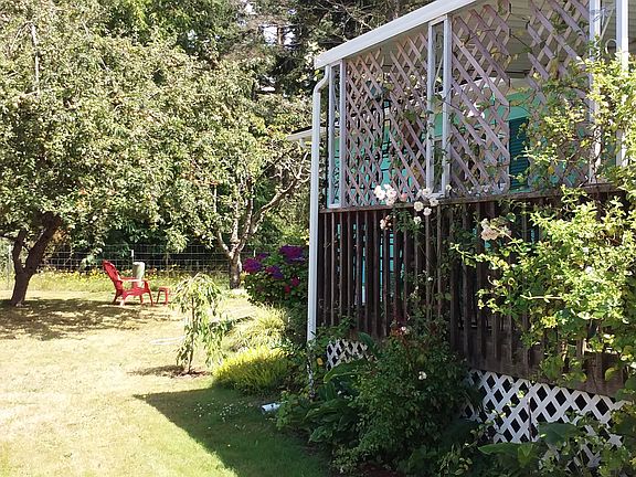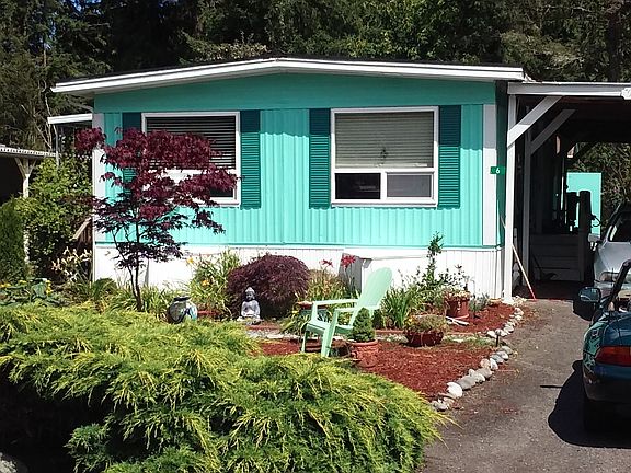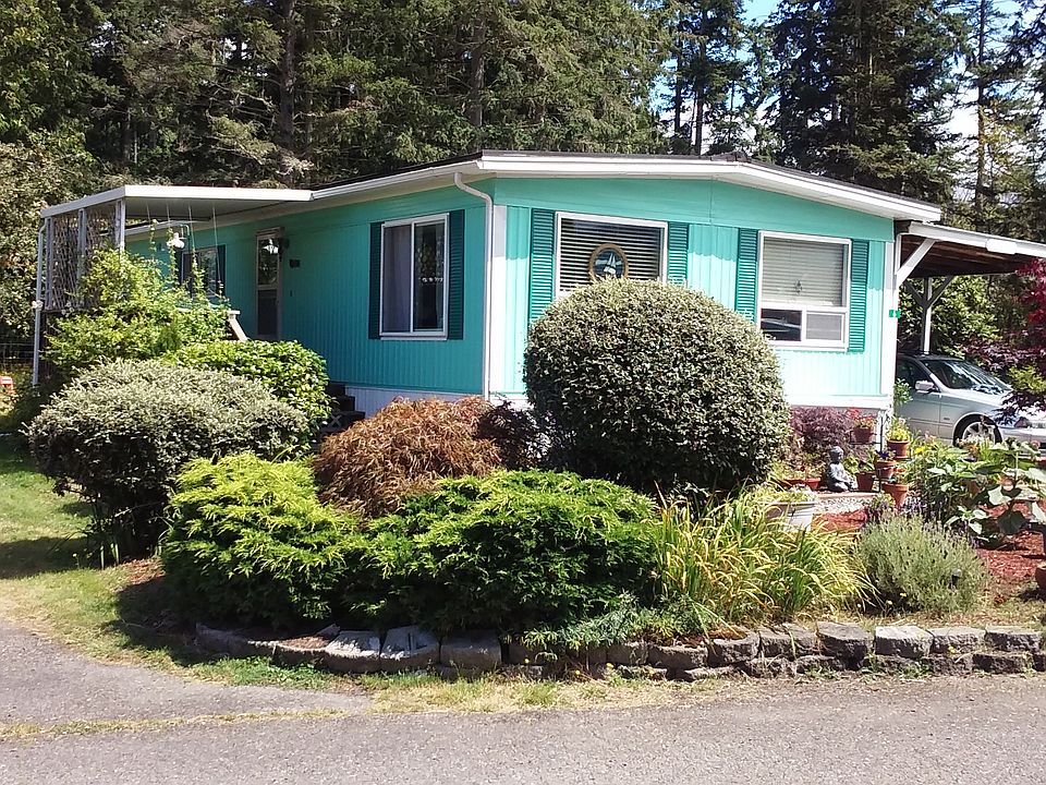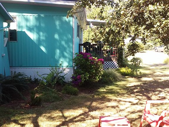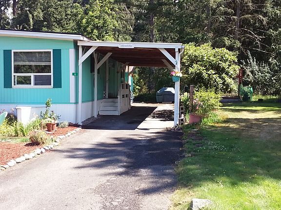 Lovely double wide (44x20) in excellent condition in a beautiful setting. Quiet, 55+ park two minutes from downtown Sequim. Two small dogs allowed (under 25 lbs.). Lot rent $300/month includes water/sewer. Average year-round electric runs about $75/month. Baywood Village MHP. Country living close to town! Exterior just completely re-painted. Roof is in excellent condition. Large two-car covered carport. 12X10 separate workshop and storage. Comfortable enclosed porch area. Prolific apple tree! Beautiful landscaping with jasmine, rhododendrons, wild roses etc. “Meadow” next door, mowed by neighbour. New vegetable garden just erected with fencing. Lot backs onto forest area. “Small” mountain views. Home has vinyl windows front and side. Comfortable living room, small dining area, remodeled kitchen, large bedroom with beamed ceilings. Second bedroom has been converted into relaxing bath tub room, but could be changed back. New laminate flooring. All appliances, including washer/dryer. New dishwasher. Lots of storage. Unobtrusive neighbours. Move-in ready, nothing needs to be done. Must be park approved. Home built in 1971, so no financing. Cash only. Owner/Seller is licensed real estate broker with Schwab Realty in Sequim. $39,500.