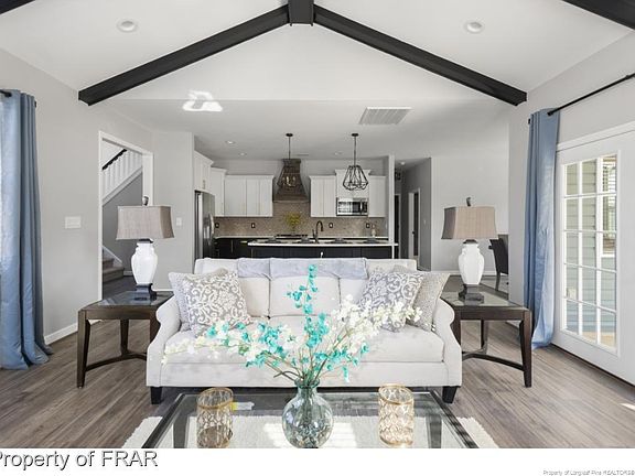 Open living with dramatic vaulted ceilings and wood beams. Full brand name stainless appliance package including a built in wine cooler, custom dove tail cabinetry, laminate wood flooring throughout living areas.