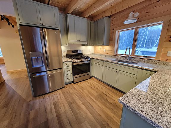 Inside, the home boasts a kitchen adorned with granite countertops and stainless steel appliances. It offers ample storage space and a convenient layout that flows smoothly into the dining room, which features a gas stove. The rustic charm of exposed beams and wood flooring can be found throughout the house, contributing to its cozy atmosphere. Moreover, the home is finished with high-quality materials.