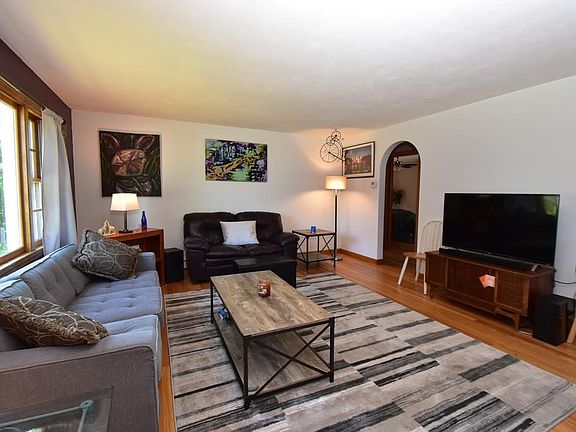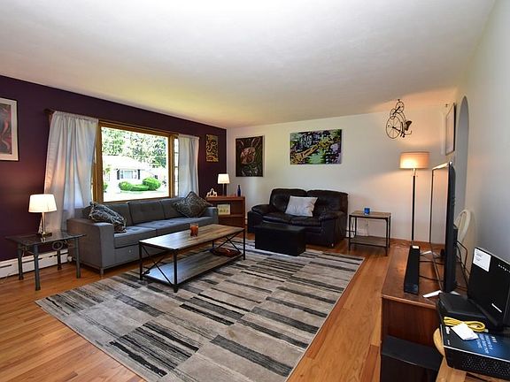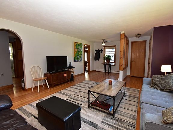 This is the one! Plenty of space, an ideal location close to downtown Easthampton and idyllic mountain views - it's perfect. With hardwood floors throughout, this tidy ranch offers two spacious bedrooms with large closets and an updated bathroom. A bright kitchen with dining nook and a living room with dining area provide options for arranging the space. The breezeway between the 1-car garage and kitchen is a cozy den with plenty of light, heating and a wall AC unit. Large partially finished basement with an additional heated room, central vacuum, laundry hook-ups, workbench and a utility bathroom. New propane heating system and hot water tank. Relax this summer on your covered patio against the unbeatable backdrop of the Mt. Tom range.