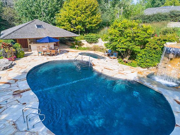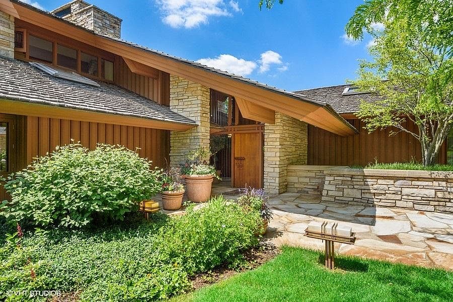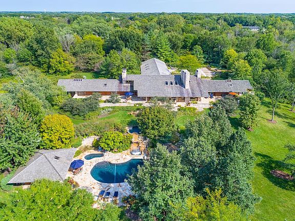There is no comparable when a noted architect, E. Fay Jones, and a homeowner with a dream come together to create a one of a kind estate in the heart of Barrington Hills. This breathtaking 7,700 square foot, 4 Bedrooms / 5.1 Bathroom, home is set on 6+ equally breathtaking private acres with a gated winding drive, stone bridge, mature trees and artfully planned gardens and hardscape. Significant engineering and architectural details throughout the home showcase Jones' talent which was cultivated from both his apprenticeship and close friendship with Frank Lloyd Wright. The large motor court and front walk with custom forged lighting leads you to the open air entry and flowing floor plan. Take note how each room offers either grand features, organic materials and/or intimate details. Also, wide eaves, floor to ceiling windows, skylights, corner windows, heated stone floors, massive stone fireplaces, large stone hearths, custom light fixtures and built-ins throughout. An open flowing plan is redefined with the stunning Living Room and Dining Room with custom crafted furniture. A full length rear patio can be reached from most rooms of the house. Beyond the amazing architecture the home boasts a gourmet Kitchen with granite counters, large island with Wolf cooktop, Gaggenau double oven, new Wolf steam oven, newer oversized sub-zero fridge, Asko dishwasher, custom cabinetry, a large walk-in pantry and Butler's Pantry with Eurocave wine frig and ice maker. The Kitchen is open to the Family Room with a soaring stone fireplace, eating area and an adjacent patio. The Primary Bedroom Suite is warmed by a stone fireplace and boasts a luxury bathroom with whirlpool and glass & stone shower. Dual dressing rooms offer custom built-in wardrobes and closets. Separate offices can be found on the main level and upper loft. There are three additional bedrooms, one ensuite and two with a Jack & Jill bath, a TV/Game Room with three sides of glass highlights year round views can