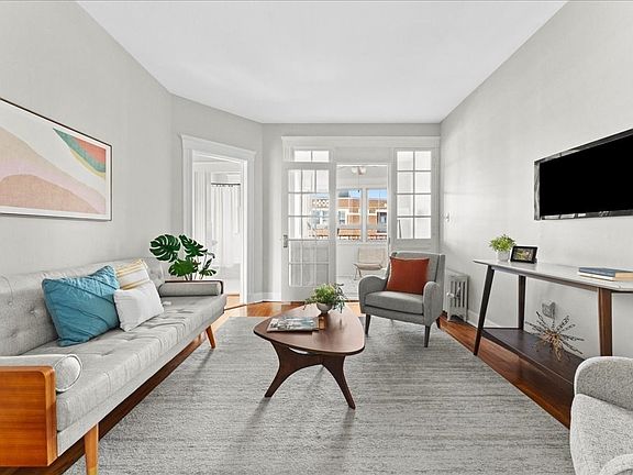 Sun-filled top-floor two-bedroom plus sunroom/office near the Emerald Necklace greenway, Hyde Square shops and Jamaica Pond. This corner condo features tall ceilings, big windows and light from all directions. Off the spacious living room, a glass door opens onto the sunroom adorned with painted brick. The kitchen offers ceiling-height cabinetry and tree views. And the versatile foyer serves perfectly for dining. Two graceful bedrooms feature period accents; one faces the tree line of the Emerald Necklace bike path. Unit storage includes linen cabinetry and a foyer closet. Downstairs, find common laundry, private storage and bike storage. Pet-friendly. Welcome spring on the shared roof deck and rear patio. Condo fee includes heat, hot water and management. On the 39 Bus route to Longwood Medical Area. Under half mile to the Green Line T; 0.75 mi to the Orange Line T. Blocks to Whole Foods, Life Alive, Tres Gatos, Abuela’s Table and the array of local shops in Boston’s Latin Quarter.