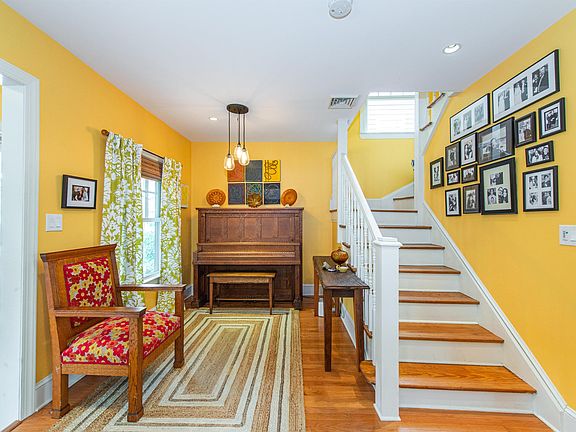 The living room features hardwood floors, a brick-front wood-burning fireplace, a piano nook and segues seamlessly into the dining room, where a large pair of sliders open to a small deck and the level backyard.
