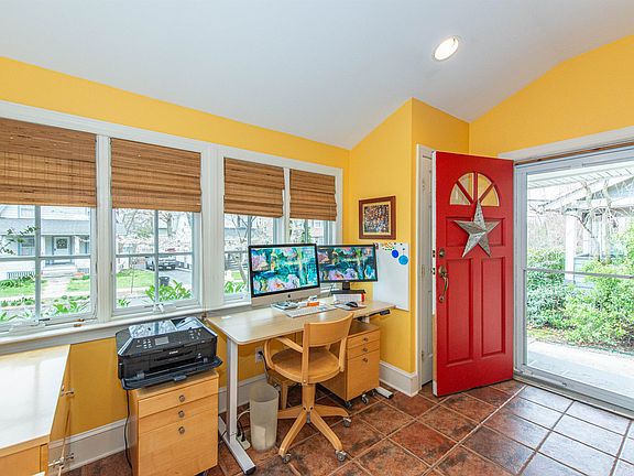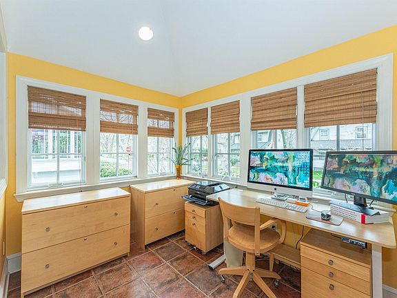 Wander past the beautiful front perennial garden boasting skip laurels, lilacs, and Annabelle hydrangeas, and head up the bluestone steps into the office (formerly the porch) with ceramic tile flooring, lots of windows and recessed lights.