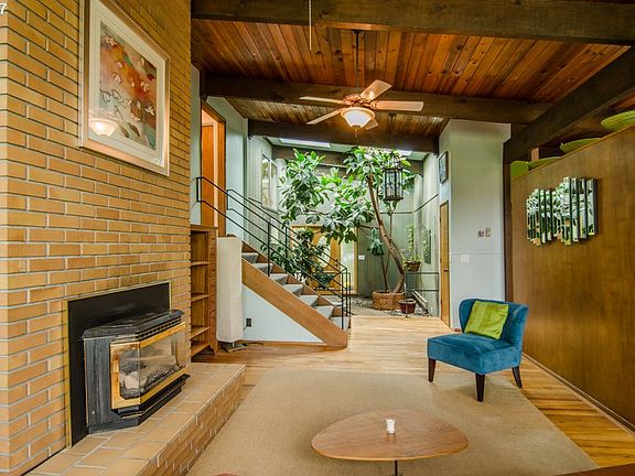 Unique Mid-Century Modern in South Eugene! This home offers a 2 story rubber tree plant in the entry atrium, vaulted tongue and groove cedar ceiling with skylights, gas fireplace, hardwood floors, 2 large bedrooms with plenty of built-in storage and a master bedroom suite. Energy efficient with double pane vinyl windows, 3 ductless heat pumps plus brand new water heater. Sit on the back deck in the fenced yard and gaze at Spencer Butte!
