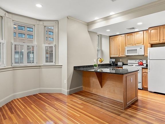 This stylish penthouse 2-bed floor through delivers with 750 SF, rear deck & parking in a in classic brick townhouse on tree lined East Brookline St. The open floor plan features a full kitchen with gas cooking, granite counters, storage pantry & breakfast bar that is open to the bay windowed living & dining area complete with soaring 8'9" ceilings & crown molding. Additional features include hardwood floors, tiled full bath with linen closet & Kholer fixtures, central air, W/D, skylight, rear deck with retractable awning & exclusive roof rights. The bedrooms offer a spacious primary with a generous closet space and the 2nd bedroom is perfect for guests/home office. Recent improvements include: freshly painted throughout, new stairway carpeting, new kitchen faucet & disposal, new bathroom sink & faucet. Super South End location with easy access to the Silver Line, restaurants, BU Medical, Foodies, Whole Foods, Blackstone & Franklin Square & shopping. Self-managed & pet friendly HOA.
