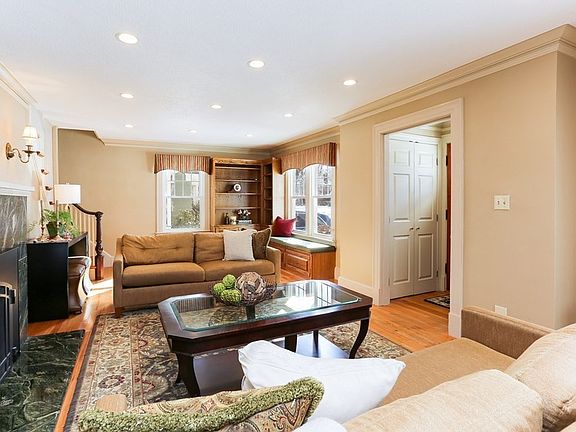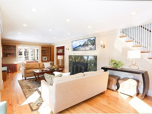 Handsome, Kibbe built colonial w/stately proportions, custom millwork, hardwood flooring & great circular flow located on lovely street. Fantastic & welcoming curb appeal leads you into large living room w/custom built-ins & gas fireplace providing sight lines of 1st floor in every direction. Great first floor living space w/living & dining rooms, four season sunroom, kitchen & family room addition. Kitchen has cherry wood cabinetry, granite tops, stainless appliances & adjacent mudroom featuring pantry, hall closet & powder room. Second floor features three bedrooms w/double closets, updated full bath & generous primary suite w/two walk-in closets w/custom shelving & updated bath. Walk up third floor showcases two more finished spaces & full bath- perfect spot for home office, fifth bedroom and/or flex space. Finished lower-level houses laundry area, playroom, cedar closet, access to exterior & unfinished space for storage. Brand new boiler & replacement windows provide peace of mind.
