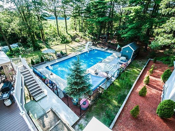 O.H. 8/13/17 12-2PM Resort like living! Hip roof Colonial in private setting with large 20x50 I/G pool. Thermaspa 5 seat hot-tub under Cabana and stars. Sixty five feet of composite decking with solar caps runs length of house and overlooks 1.7 acre parcel. Cathedral ceiling and bow window in fire placed family room, step thru slider to deck. Very dramatic bonus room over garage. Juliette balcony, Anderson windows and doors, beamwork, skylights -well designed floor plan. Walk through attached mudroom/breezeway connects main house to garage and possible in-law. Open kitchen has granite counter tops and pennisula with pot rack and SS appliances.Ceiling fans in most rooms. Massive heated garage is a car enthusiasts dream, I beam construction, work area, hydraulic lift and air lines in place. Super neat! New 10x20 shed with roll up door for additional storage. Walk out finished basement with tap and wet bar. Mature fruit trees, vineyard. Many pool toys included. Abuts conservation land