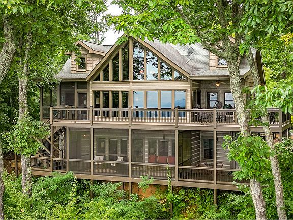 Most BREATHTAKING VIEW on the market! See 3 States from this true LOG, LODGE STYLE home; fully updated combining rustic & modern design. You'll love the prow front wall of windows enjoying spectacular views, regardless of the weather. Home features 3 levels of living, great for family gatherings, 5BR/4.5BA (sleep 10-12+) Soaring cathedral ceilings, stone fireplace, dining area & well appointed kitchen. Master suite w/rock shower, live edge countertop & walk-in closet. Upper level has a small loft, 2BR/1BA. Terrace level features a huge family/game room, 2 ensuite bedrooms w/rock showers. Fantastic outdoor living w/oversize deck spanning the length of the house, covered grilling porch, 2 screened porches, & firepit area. Nestled on 2.66 acres, end of road privacy, 20 min. to Blue Ridge, near National Forest, hiking/biking, more. (Selling furnished!) This community currently allows vacation rentals.